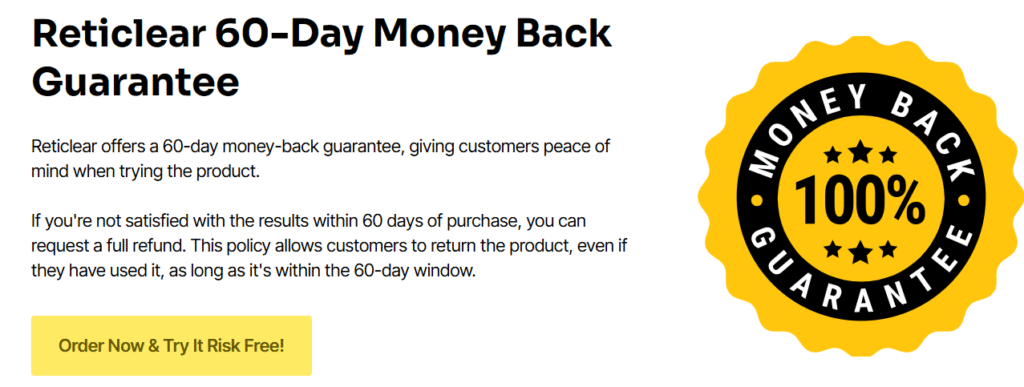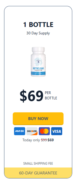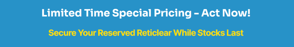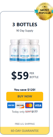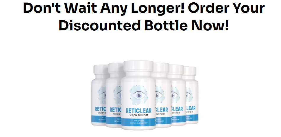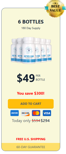 ORDER NOW 6 BOTTLES $294*Disclaimer: Reticlear is a dietary supplement. These statements have not been evaluated by the Food and Drug Administration. This product is not intended to diagnose, treat, cure, or prevent any disease. Individual results may vary. Consult your physician before beginning any new supplement.