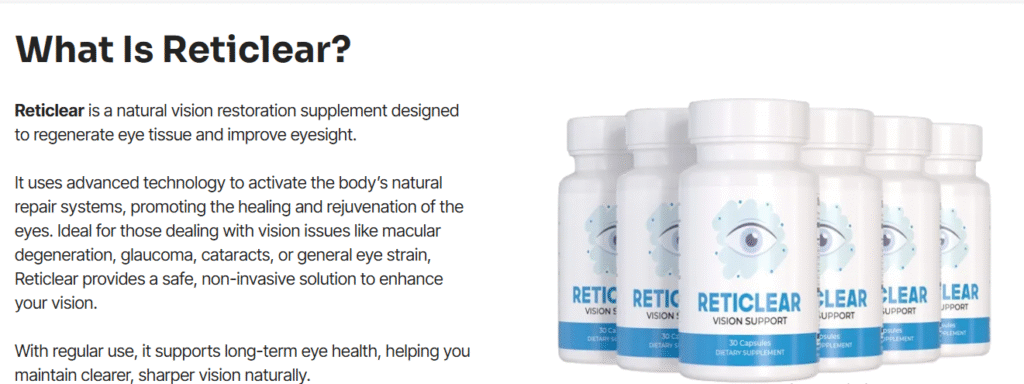 Reticlear is a powerful **dietary supplement** formulated with essential nutrients and potent antioxidants to combat modern eye strain and age-related decline. Give your eyes the nourishment they deserve.